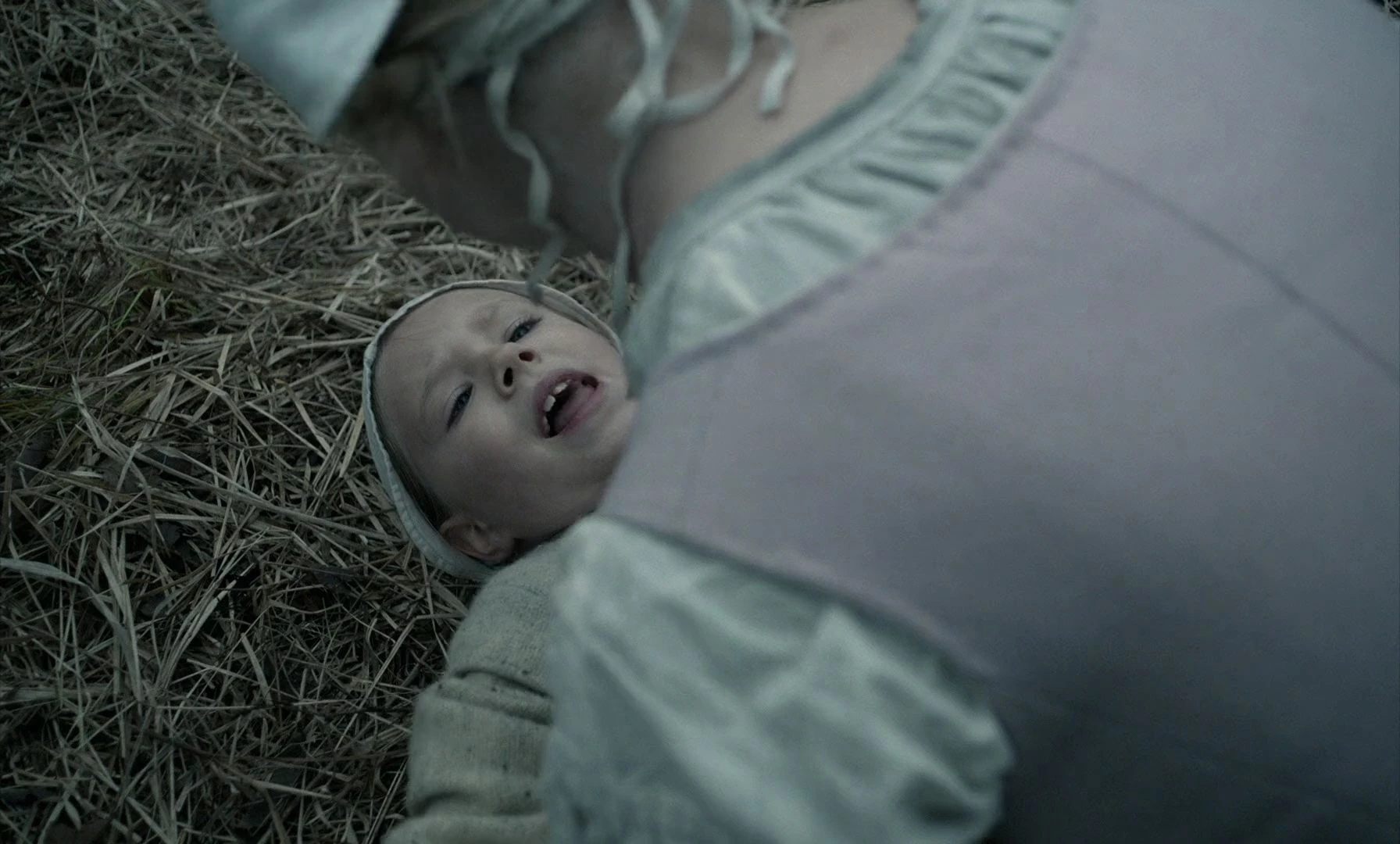 Several months later, the family have settled into their new home, acquired several livestock and welcomed a new baby boy, Samuel. One morning, Thomasin prays and confesses she has lived in sin; ignoring her work, disobeying her parents, neglecting prayer and following her own desires rather than those of the Holy Spirit. She begs God's forgiveness and mercy, while accepting the she deserves eternal suffering and hellfire. She later takes care of Samuel while Katherine rests. She takes him out close to the woods and plays peek-a-boo with him. One moment, she covers her face with her hands and when she removes them she finds him gone. She panics, and seeing twigs and small trees swaying as if something has just moved past them at great speed, she runs towards the forest and derperately calls his name.