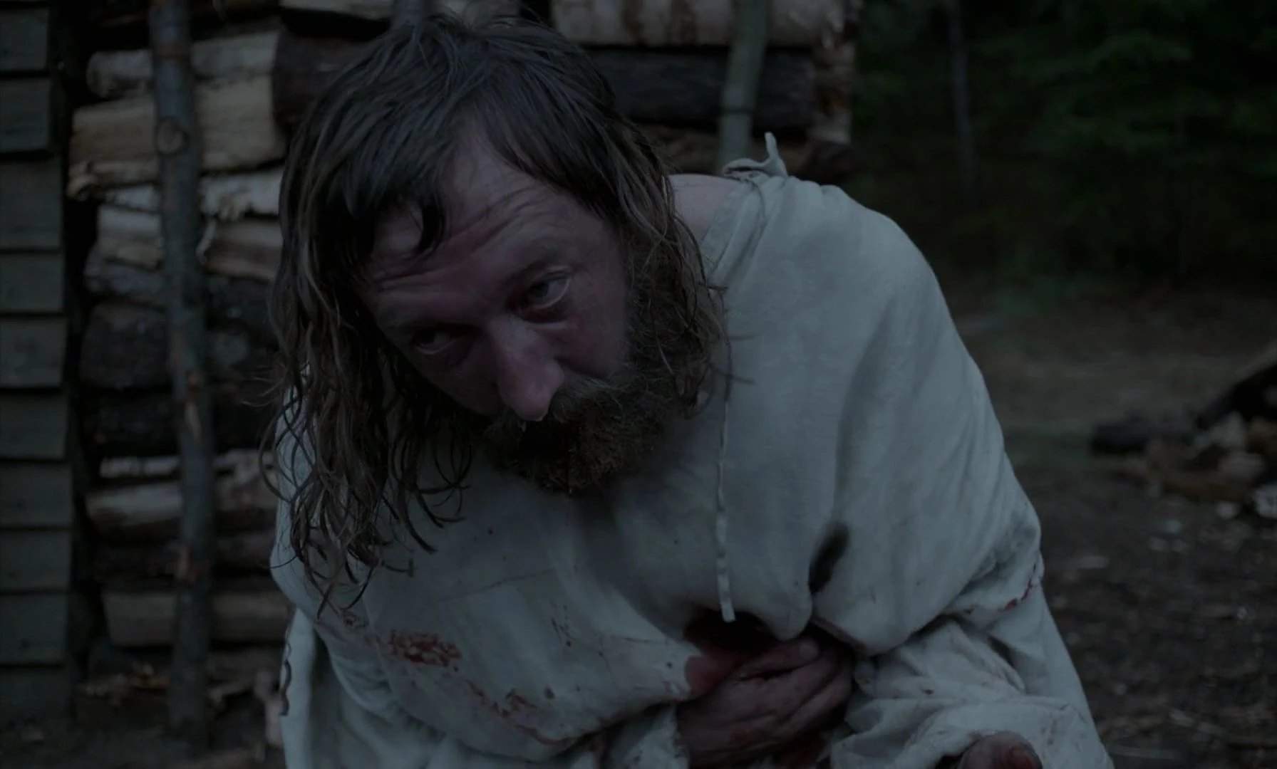 In the woods, William has Caleb recite the concept of original sin to him. They find one of the traps empty and set it again. Caleb worries that Samuel is in Hell due to the fact that he was not baptized and worries that the same will happen to him due to his unconfessed sins. Williams tells him that he wishes he could reassure him, but cannot, as only God knows who is a sinner and who is not. Caleb asks where he got the traps and William replies that he sold Katherine's silver cup, an heirloom from her father, to Indian Thom and Old Slater when last they passed through. He asks Caleb not to tell Katherine this, as she is burdened enough already. The family dog, Fowler, spots a hare with an unusally sharp stare.William and Caleb fumble to load the shotgun and as William attempts to shoot the hare, the gun backfires and sprays gunpowder into his eye. The hare escapes.