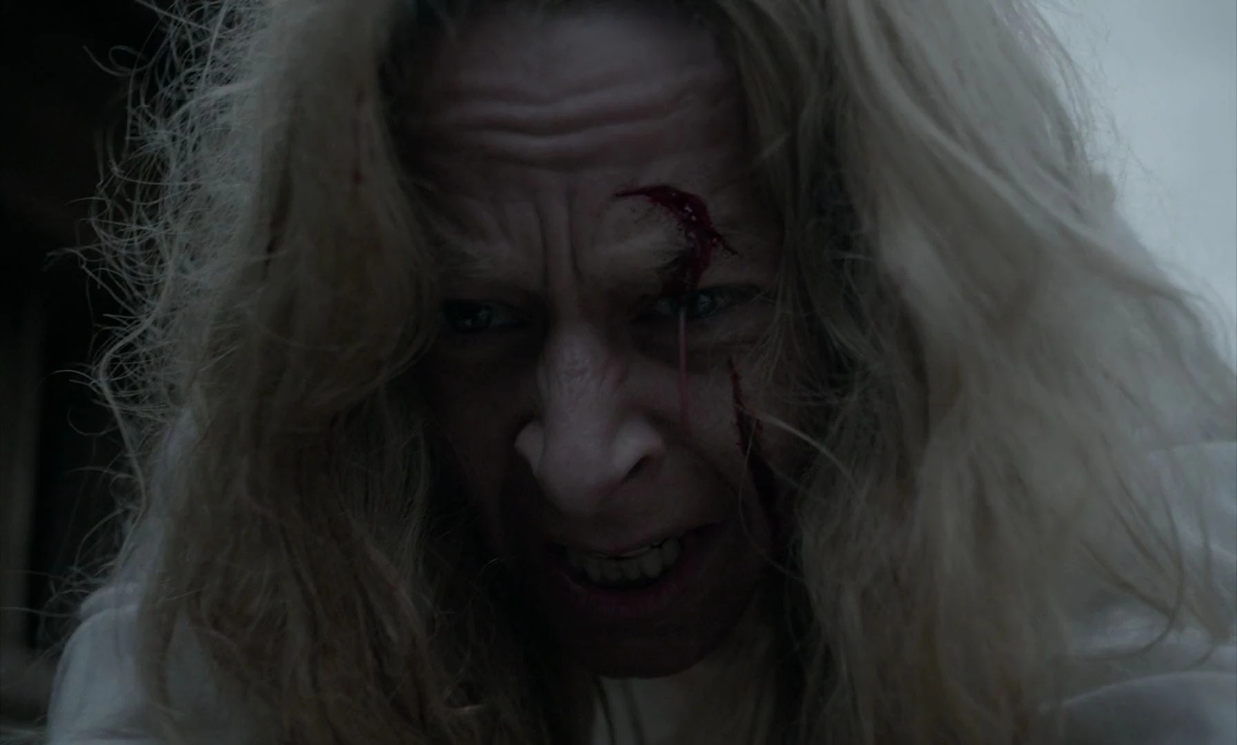Katherine emerges from the house and demands to know what Thomasin has done. She accuses her of murdering the twins and making covenant with the Devil. She then accuses her of seducing and bewiching Caleb and William. Thomasin denies her accusation and Katherine attacks her, while her daughter declares her love for her and begs her to stop. Thomasin grabs a nearby knife and slashes Katherine's forehead, but she begins strangling Thomasin. Thomasin slashes her several more times and cries as her mother's corpse falls upon her. She pushes Katherine's corpse off of her, stands up in a state of shock and stares out towards the woods. She then goes back into the house, where she rests her head on the table and falls asleep.